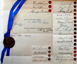 The new deed re-established the Edison Medal in partnership with the New York Trust Company and the American Institute of Electrical Engineers (AIEE). It reasserted that the medal "should, during the centuries to come, serve as an honorable incentive to scientists, engineers and artisans to maintain by their works the high standard of accomplishment set by the illustrious man whose name and features shall live while human intelligence continues to inhabit the world." The Amended Deed also re-wrote the rules and established that the AIEE would present the medal as its award for "...MERITORIOUS ACHIVEMENT [emphasis in document] in Electrical Science or Electrical Engineering or the Electrical Arts, whenever in the judgment of said Committee [there is someone] properly deserving of such award..."[17] Revisions to the Committee's bylaws commenced in October 1908, and the final draft was presented to the Board of Directors on December 11, 1908.[18] The Board approved the minutes on May 18, 1909, making operative the revised by-laws and new rules.[19] Later, the AIEE appointed a jury of 24 members to select the recipient of the award.[15]