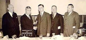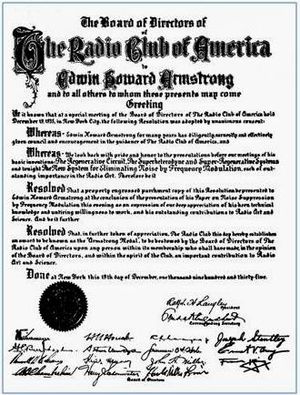 - ↑ Seven small versions of the Armstrong Medal were awarded in 1950 to Ernest V. Amy, Major Edwin Armstrong, George E. Burghard, Minton Cronkite, Paul F. Godley, John F. Grinan and Walker P. Inman in recognition of their achievement (Story, 1950; Radio Club, 2011a).