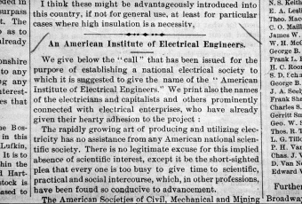 - ↑ The early history of the American electrical profession, the beginnings of American professional societies and the emergence of the AIEE are explained in Ryder & Fink, 1984; Century of Electricals, 1984; McMahon, 1984; Israel, 1992. The history of the IEEE and its predecessor organizations is also at IEEE Global, 2011e-k; Reiman 1984, 1989a&b.