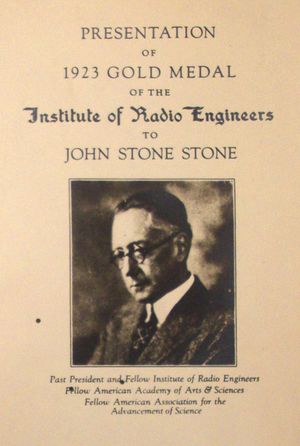 - ↑ Stone was a telephone engineer with the American Bell Telephone Company in Boston. In 1901 he formed the Stone Wireless Telegraph Syndicate which was followed in 1902 by the Stone Telegraph and Telephone Company (collectively, “STTC”). Stone developed telephone battery systems and carrier current transmission systems. In radio, he pioneered adjustable tuning methods focusing on selectivity, single wave emission and the use of loose-coupled circuits. After the collapse of STTC in 1910, Stone became a consultant and expert witness in patent cases, eventually going to American Telephone and Telegraph Company in 1920. During the course of his career, he obtained 120 patents on his radio and telephone inventions (Dunlap, 1944; Clark, 1946; Architects, 1984).