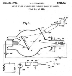 The iconoscope [from the Greek words "ikon" (image) and "skopion" (to look at)] was a new approach to television—one that relied entirely on electronics rather than a combination of electronic and mechanical devices. Vladimir Zworykin had the idea of projecting an image onto a special plate, which was covered with tiny dots of a chemical that is sensitive to light. In a sense, this broke up the image into thousands of picture elements or "pixels." Then, he swept an electron beam across the face of the plate, which had the effect of "charging" the pixels. After the electron beam swept past a pixel, the pixel retained an electric charge, which was then fed to the output of the camera. In this way, a visual image was converted to an electric signal without the need for heavy, rotating wheels as in previous television attempts that used variations of Nipkow's disk. There had been other attempts to produce an all-electronic camera tube, but the Zworykin model was easier to manufacture and produced a very clear image. On 29 December 1923 Vladimir Zworykin filed a patent application on his Iconoscope, although the patent was not issued until 20 December 1938.