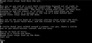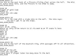 Adventure is able to parse two word commands in VERB – NOUN format; i.e. GO NORTH, GET CAGE, or DROP STICK, although limited to five characters per word (the game instructs the user to use “NE” in place of “NORTHEAST”). As an anonymous Adventurer, the player must explore a vast system of caves, solve puzzles, and collect all the treasure to receive all 350 points. The world is broken down into a number of rooms which are interconnected amongst one another, sometimes in a non-linear fashion, by directional points (N, W, E, S, etc). Rich descriptive text is provided for each room, as well as the various items and entities in them.