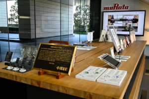 In the ground floor lobby of the Murata Manufacturing Co. headquarters building is a Special Exhibition Area that includes a table displaying the Milestone plaque with important company products and awards.