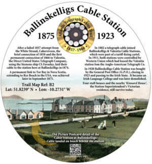 - Site 1: on a white pillar at the right side of the street entrance to the Eighth Wonder - Transatlantic Cable Station museum (the original Valentia Transatlantic Cable Station), now a UNESCO World Heritage Site