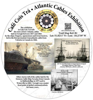 On July 13, 1866 the Great Eastern steamed westward from Valentia, laying telegraph cable behind her. The successful landing at Heart's Content, Newfoundland on July 27 established a permanent electrical communications link that altered for all time personal, commercial and political relations between people across the Atlantic Ocean. Later, additional cables were laid from Valentia and new stations opened at Ballinskelligs (1874) and Waterville (1884), making County Kerry a major focal point for global communications.