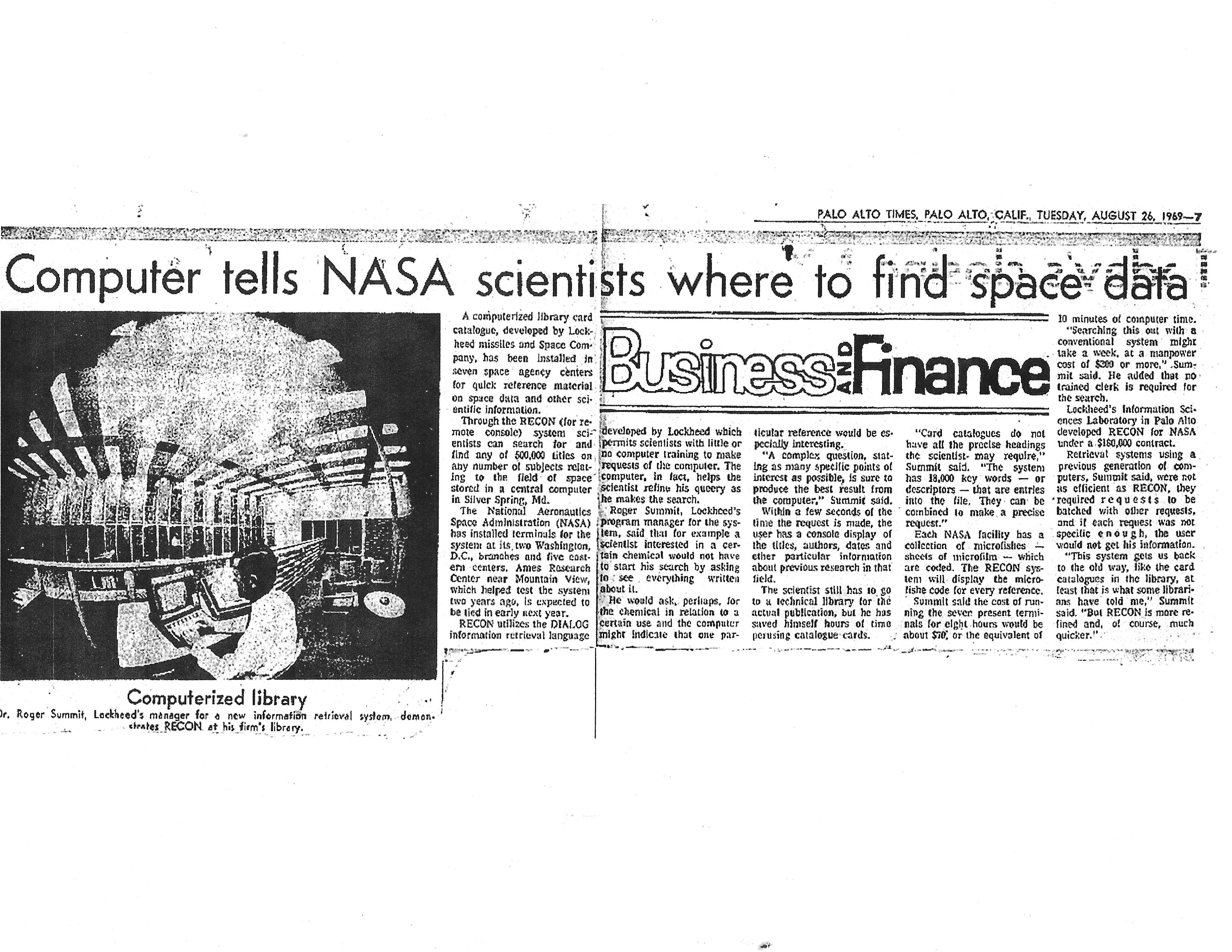 How DIALOG allowed NASA to overcome the problem of finding documents within its huge data catalog is described in an August 26, 1969 newspaper article titled "Computer tells NASA scientists where to find space data" which states that DIALOG "helps the scientist refine his query as he makes the search." [Ref15: NASA 1969 Story] Note that this story was published about five weeks after the first lunar landing by Apollo 11.