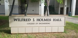 - Site 1: On an exterior wall between 2 pillars on the long side of Holmes Hall facing Dole St., in line with a pedestrian walk signal on Dole St.; this is the College of Engineering Building on the campus of the University of Hawaii at Manoa