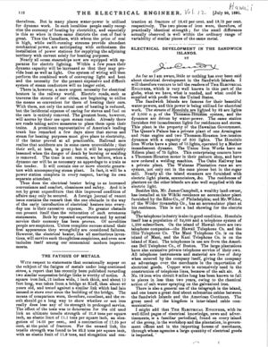 26/03/1888 – The Pacific Commercial Advertiser article, “A New Danger,” reports that an accident occurred when wires contacted a tree. Another article, “The Electric Lights,” reports that there are two circuits, one fifteen miles and other six miles. The dynamos are run by water and pressure at the water wheel is 130 pounds per square inch (psi). The lamps are 2,000 candle power each. [9-seq2- 2 adv 18880326]