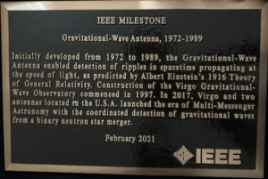 Initially developed from 1972 to 1989, the Gravitational-Wave Antenna enabled detection of ripples in spacetime propagating at the speed of light, as predicted by Albert Einstein's 1916 Theory of General Relativity. Construction of Hanford's Laser Interferometer Gravitational-Wave Observatory (LIGO) commenced in 1994. In 2015, LIGO antennas, located here and in Louisiana, first detected gravitational waves produced 1.3 billion years ago from two merging black holes.
