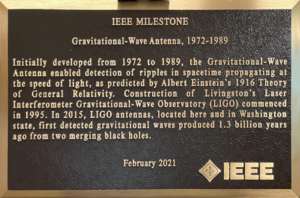 Initially developed from 1972 to 1989, the Gravitational-Wave Antenna enabled detection of ripples in spacetime propagating at the speed of light, as predicted by Albert Einstein's 1916 Theory of General Relativity. Construction of Livingston's Laser Interferometer Gravitational-Wave Observatory (LIGO) commenced in 1995. In 2015, LIGO antennas, located here and in Washington state, first detected gravitational waves produced 1.3 billion years ago from two merging black holes.