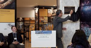 On a marble pillar in The Gallery at Kodak Center, located off the ground floor lobby, adjoining an exhibit area whose artifacts include the world's first digital camera as created at Kodak by Steven Sasson.