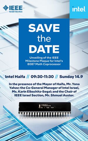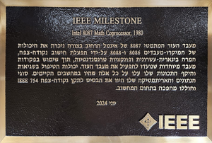 The two plaques (one in English and one in Hebrew) are mounted on each of two plinths, which are located along an outdoor pathway leading to the IDC2 lobby. This is a short distance from the original "warehouse" where work on the 8087 began.