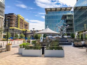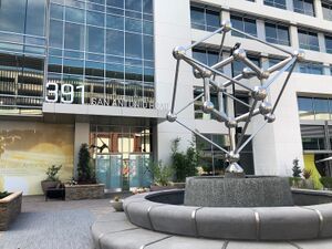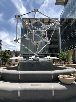In Technology Plaza, on the northeast edge of a fountain containing a 20-foot high artwork in the form of a silicon crystal lattice; accessible from California St. just east of San Antonio Rd.