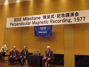 In 1977, Professor Shunichi Iwasaki led his Tohoku University team in developing a magnetic recording system with a pole head writing on a cobalt-alloy, thin-film perpendicular medium having a soft magnetic underlayer. This medium and configuration enabled data recording densities beyond those possible with longitudinal recording. Since 2005, perpendicular magnetic recording has played a crucial role in the continued growth of magnetic storage device capacity.