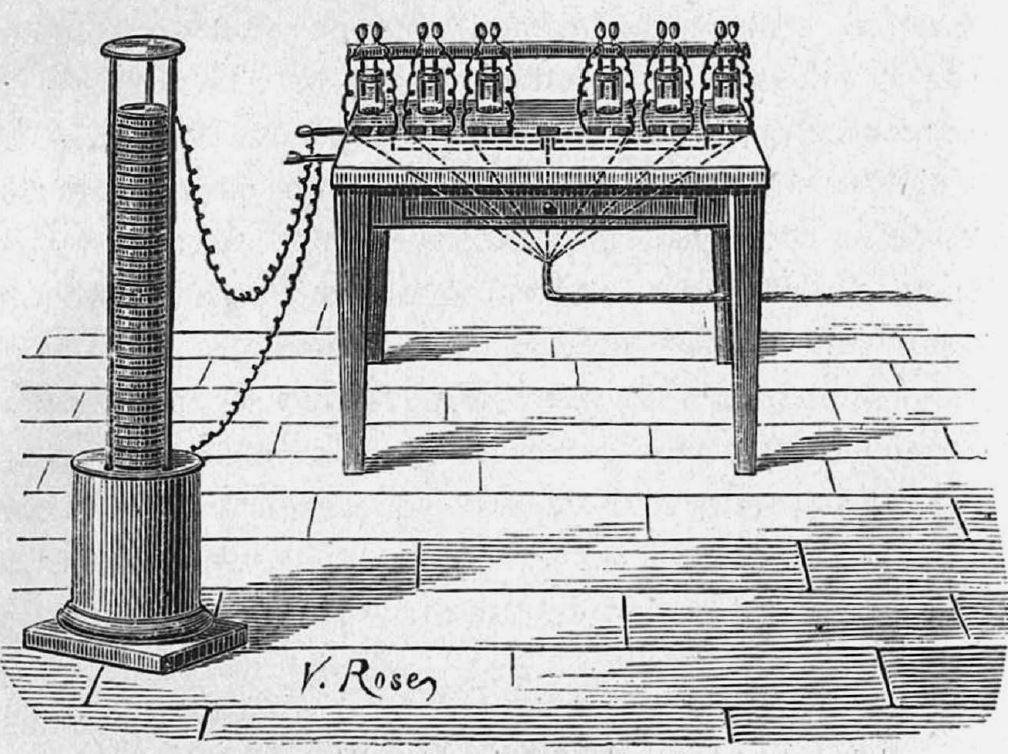 An artistic recreation of the 1804 Salvá's electric telegraph, as it was imagine by the Spanish historian and electrical engineer Antonino Suárez Saavedra, was reproduced in his popular treatise on telegraphy, written in 1880 [14].