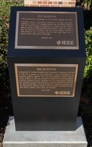 - Site 1: On an aluminum monument installed to the right of the street entrance to Pixar Animation Studios' campus (Note: below this plaque is a duplicate of the "Development of Computer Graphics and Visualization Techniques, 1965-1978" plaque, whose original is at the Univ. of Utah)