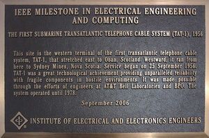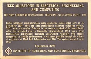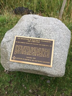 This site is the western terminal of the first transatlantic telephone cable system, TAT-1, that stretched east to Oban, Scotland. Westward, it ran from here to Sydney Mines, Nova Scotia. Service began on 25 September 1956. TAT-1 was a great technological achievement providing unparalleled reliability with fragile components in hostile environments. It was made possible through the efforts of engineers at AT&T Bell Laboratories and BPO. The system operated until 1978.