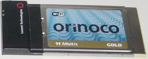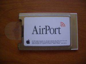 With a standard in place, Steve Jobs of Apple Computer decided to add wireless communications to the MAC books. He requested proposals from the various vendors. All were happy to oblige, but just one accepted the challenge of the $100 retail price requirement when the price point was still at around $350. It was the management of the WaveLAN-team that took the challenge and prepared a manufacturing environment streamlined to produce large quantities at low cost. At the MACWorld on July 21st, 1999, Apple Airport was launched [13] with the PC card (Figure 6) at $99 and the access point at $299 (Figure 7). At the same time, the WaveLAN-team, now with the corporate name of Lucent Technologies, launched their own PC card (Figure 8) and access point for similar prices. Immediately, all PC vendors queued at the engineering group with the request to develop a version for their own market. Apple requested a 2 Mbit/s product, but received an 11 Mbit/s product, which was according to the IEEE 802.11b extension of the standard. The result of a joint proposal of the WaveLAN team and Harris Semiconductors.