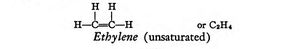 Ethane is also one of the constituents of natural gas. In this case each carbon atom holds three hydrogens, the fourth being replaced by the second carbon atom. Further members of this series of saturated hydrocarbons are formed in a similar way, with more carbons and hydrogens extending out in a straight-chain structure; thus, a large and important group of saturated hydrocarbons is built up. This "straight-chain" group was referred to as aliphatic hydrocarbons. In the above compounds the carbon atoms are united between themselves by only one dash, which is considered as representing one chemical bond. However, a very large group of hydrocarbons contain atoms which are joined by two or more chemical bonds. This may be visualized from the following picture of the simplest member of this series: This hydrocarbon is called ethylene[11] and is also a gas. (FIG. 9).