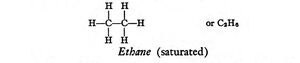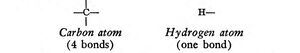 When atoms combine to form a chemical molecule, each carbon[6] atom is capable of holding or attaching to itself four hydrogen[7] atoms, or their equivalent. When it does so, the carbon atom is said to be saturated.[8] The attractive force holding the atoms together, and indicated by a straight line, is called a bond, or linkage.