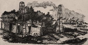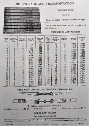 The smaller ones were called day tanks. Located in the proximity of the producing well, these were utilized for storing petroleum collected daily or weekly, depending by the yield of the well. Larger tanks generally built closer to transportation hubs, such as railways and river ports, stored oil as a stage in the transportation to refineries. In Ontario, where the geological conditions were favourable, it was possible to build semi-underground storage tanks made of horizontal rings of wood to resist lateral earth pressures and attendant earth slides.
