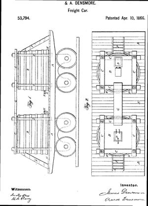 The New Yorker brothers Amos and James Densmore were the first to commercially produce rail tanks, marking the first massive turning point in the history of the petroleum logistics. Between 1863 and 1865 they engineered and tested their prototype of a rail tank car consisting of a pair of wooden tanks mounted on a flat tank. After much testing, on April 1866, they successfully patented their 3400-gallon tank car composed of two vertical positioned cylindrical vats (later a 3-vat longer version was also patented), made with wooden plates fastened by metal rings and with lids secured to a flatcar. These bore a close relationship to the twin containers used to haul iron ore and coal in the early days of the railroad, and this likeness showed a possible technology transfer, or at least influence in the design.
