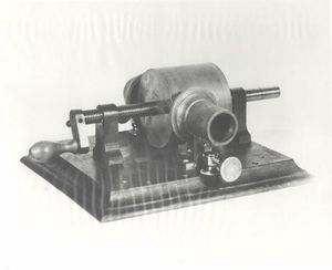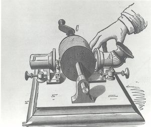 However, continued experiments with recording the telephone did not result in a satisfactory sound recording machine. Instead, Edison tried to record sound directly from the air. After trying several different ideas, Edison’s assistants constructed something that was like a modified version of the phonautograph, a scientific device for recording sound waves on paper or glass. This was the first cylinder phonograph, a machine that embossed the sound record in a groove on a thick sheet of tin foil.