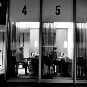 Bell Labs resumed video telephone research in 1956. From this work came the April 1964 debut of the Picturephone as a major attraction at the AT&T Bell System pavilion at the New York World’s Fair.[1] A set of eight Picturephone booths allowed fair visitors to make their own video telephone calls. For the most part, selected visitors conversed with visitors in adjacent booths, though on occasion a booth would be connected to a similar booth at Disneyland in California. This proved a very popular exhibit. Bell Labs interviewed seven hundred of the many visitors; half thought that it seeing the other person was important in a telephone conversation, but half did not.