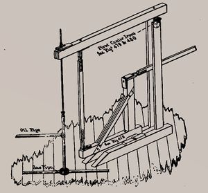 In the 1870s-80s, the metal device named pump jack, first conceived by Plackross in 1877, replaced the wooden structure that served the early industry so well, and it then spread over the south and west of the United States. The pump jack uses the same principle of the walking beam, converting the shackle line’s horizontal reciprocating motion to a vertical reciprocation motion. In the 1880s, pump jacks they assumed numerous configurations but nearly all were classed as either "direct lift" or "indirect lift." Each type relied on a vertical triangular frame or "knee," with one comer connected to the shackle line, one to a pivot mount, and the other connected directly, or indirectly, through a steel pitman and walking beam arrangement, to the polished rod.