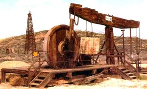 Beginning in the late 1850s, walking beams were the most common pumping well devices used in the petroleum fields of Pennsylvania, West Virginia and Ontario. This apparatus was already used in the sweet water and salt mining industries and was transferred in the early petroleum fields, like it was for derricks, drilling bits, boilers, and many other field equipment. The wooden walking beam, the rocking arm, was pivoted in the middle on top of a Samson Post. On the back end of the walking beam was a counterweight, which often was a wooden box filled with rocks. Behind the box was mounted a pitman, which raised and lowered the pump in the well. The pitman runs from the outer edge of the band wheel, the characteristic large wooden wheel spinning at the back which connect the pump to a steam engine, to the back end of the walking beam. As the wheel rotates this pivot arm causes the beam to rock back and forth, thus moving the sucker rods up and down. On the front end was the polish rod (or sucker rod), that runs through the casing head to move down into the well hole. The rod is connected to the pump that sits in the section of the well immersed in petroleum. When the sucker rods push down on the pump, a valve on it opened up so that as the pump moves down, petroleum can flow into the chamber above the valve. When the upstroke begins, the valve closes and the petroleum shifted above the valve is then lifted upward. At the same time, petroleum from the reservoir moves into the void beneath the valve, and as the down stroke begins the valve opens back up; in doing that, the cycle began anew and petroleum is lifted to the surface, one upstroke at a time.