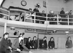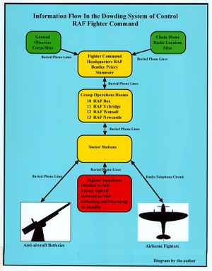 The plots showed not only the positions and information on raiders, but also the positions of friendly defending aircraft. The group operations controller could also see a series of status boards giving the state of each squadron under their control. With a series of colored lights the boards conveyed such squadron information as ‘detailed to raid,’ ‘enemy sighted,’ ‘ordered to land,’ ‘refueling and rearming,’ and ‘at standby,’ The group operations controllers decided what raid should be assigned to what sector, how many aircraft should be used, and when they should be scrambled. The Sector Station commanders then decided what squadrons at what locations should join the battle, and sector fighter directors coached the fighters to their targets. The whole plotting, filtering, and ordering process from target position measurement by a CH operator to heading and altitude orders transmitted to a fighter had to be done in less than three minutes. And it was. [35, pp.24-25] [21, p.39]
