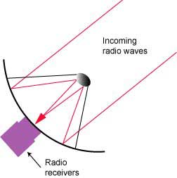 A radio telescope typically consists of a parabolic (bowl-shaped) antenna similar to a modern satellite dish. This dish collects incoming radio or microwave radiation and focuses it onto a sensitive receiver located behind or below the antenna. Inside the receiver, the incoming waves are converted into electrical signals. Computers then process those signals to form images of the sky as it would look if our eyes were able to see at radio or microwave frequencies.