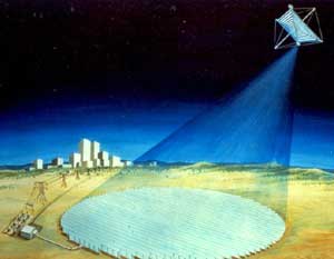 It was during the late 1960s that the engineer Peter Glaser first had the notion of solar power satellites. The principle of transmitting power by microwaves had already been demonstrated, though not put into practice. (Microwaves in practical devices, such as radar systems and long-distance telephone relays, were used to convey information.) To convey information, the intensity of the received signal need only be less than one nanowatt (one billionth of a watt). Glaser’s idea was to put the solar-power satellites in geosynchronous orbits, so that each would hover over a single location on the earth. This meant, however, that the satellites had to be very high (36,000 kilometers or about 22,000 feet), and this in turn meant that the antenna on the satellite and the receiving antenna on the ground had to be extremely large (a kilometer or more in diameter). The idea did not seem practical, and after some initial funding by the U.S Department of Energy and NASA there was little interest in pursuing the technology.