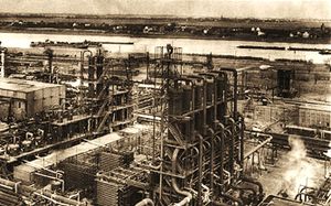 In 1918, while Bergius was still working on the finalization of his production project, another groundbreaking process was developed by the chemists Fritz Haber (1868-1934)[5] and Carl Bosch (1874-1940).[6] The Haber-Bosh process entailed the synthesis by catalytic formation of ammonia from nitrogen and hydrogen at high pressure and temperature. Ammonia cannot be classified as a synthetic fuel, but it was the basic chemical for producing fertilizers and explosives. In the following decades, many of the chemical corporations producing synthetic fuels were also ammonia producers. Regardless of the differences in the production processes, investments in fuels and ammonia intersected and moved along in the development of the shared knowledge that dramatically improved the production methods to obtain large quantities of hydrogen from coal at low cost. The groundbreaking know-how and practices to handle techniques for industrial operations at high pressures, and the shaping of cadres of German scientists mastering in catalysts (science of materials) and catalysis dynamics (applied chemistry). The German postwar experiments on the production of gasoline from coal moved forward rapidly, and in 1921, within three years after the end of the war, the goal was successfully achieved.