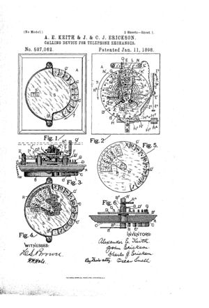 A.E. Keith and J. and C.J. Erickson. 1898. “Calling Device for Telephone Exchange”. U.S. Patent 597,062, 11 January 1898. Filed 20 August 1896.