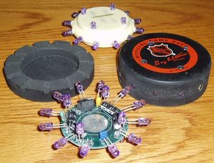 The goal was to make the puck visible by color enhancing it. In the final product, a blue glow was superimposed on the puck as it moved over the ice. When the puck went airborne, the trajectory would be displayed as blue streak. If the puck went over a certain speed, the streak would turn red for dramatic effect. To implement this enhancement required 3-D tracking technology as sophisticated as any advanced military system. New technology was also needed to match the tracking data to the image field produced by the television camera. Special sensors to measure zoom, pan and tilt, were designed and mounted in the cameras. Additional sensors had to be placed throughout the rafters of the hockey arena to guarantee a precise fix in three-space and any instant in time, regardless of the obstacles blocking the puck on the ice. In the greatest technical challenge, the transmitting electronics had to be resistant to shocks, able to be “seen” regardless of the pucks orientation and location in space, have an adequate supply of power, …and be small enough to fit into a puck! There was one more critical constraint. As it moved around the ice, bounced off the boards, and hit by the hockey stick, the new puck had to behave like a standard game puck.