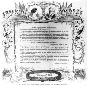 In August 15, 1858, Queen Victoria sent a telegram to President Buchanan. It congratulated him on the successful completion of the transatlantic cable. That had been a joint American and British effort, spearheaded from the American side by an indefatigable financier, Cyrus West Field, and on the British by a telegraph company. The message of ninety eight words took sixteen and a half hours to transmit.