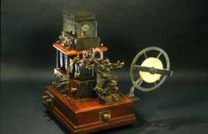 Operators using Thomson’s mirror galvanometer initially were able to receive three words per minute; with practice they raised this to about seventeen. But no permanent record was produced. Thomson’s response was to suspend a coil between the poles of a magnet. Threads from the coil were attached to a slender glass tube that had one end in ink and the other facing a moving paper tape. To reduce friction, the ink was electrified and deposited on the paper in spurts. The coil, which was part of the telegraph circuit, twisted back and forth in response to the signals, and a wavy line appeared on the tape. This “siphon recorder” was initially capable of receiving a dozen words per minute, a number that increased by a factor of three or more by the end of the century. Introduced in 1867, it remained the principal receiving instrument on long submarine lines for half a century. The mirror galvanometer was used as a sensitive test instrument into the 1950s.