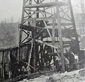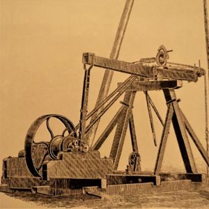 The mechanism served as the walking beam set on a samson post (this gave the signature “T” shape) to transmit the rising-dropping motion to the borehole, vertical-moving, equipment. Cable tools were suspended on the manila rope line (the American System), or wooden drilling rods (Canadian System). When the machinery was activated, the oscillating motion was transmitted to the walking beam, which in turn imparted a reciprocating motion to the drilling bit (chisel), the latter thus struck the ground to be drilled at set intervals given by the speed distributed through the spinning gears. The rising and falling of the walking beam at the surface imparted a vibratory action to the suspended drilling line that caused the line to alternately stretch and contract. With this movement, the drilling tools would lash out several feet and strike the bottom of the drill hole with great magnitude. The force generated by the firm and consistent hammering of the walking beam exceeded the secular perforation speed and depth limits imposed by manual and mechanically assisted (spring pole) systems.