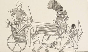 The first major battle in which the chariot was a deciding factor came in the 15th century B.C., when the Egyptian Pharaoh Thutmose pulled a brilliant flanking operation and subdued the Canaanites, thereby subjecting an entire geographic region to Egyptian domination. Egyptians later developed chariot warfare to an exact science. Their tactics are documented in great detail in the description of a battle that took place in the l3tl1 century B.C. between Ramses 11 and the Hittite king Muwatallish at Kadesh, a site on the Orontes River in modern Syria. The account gives us a mental picture that bears an eerie similarity to aerial views of vehicles advancing in parallel during Desert Storm.
